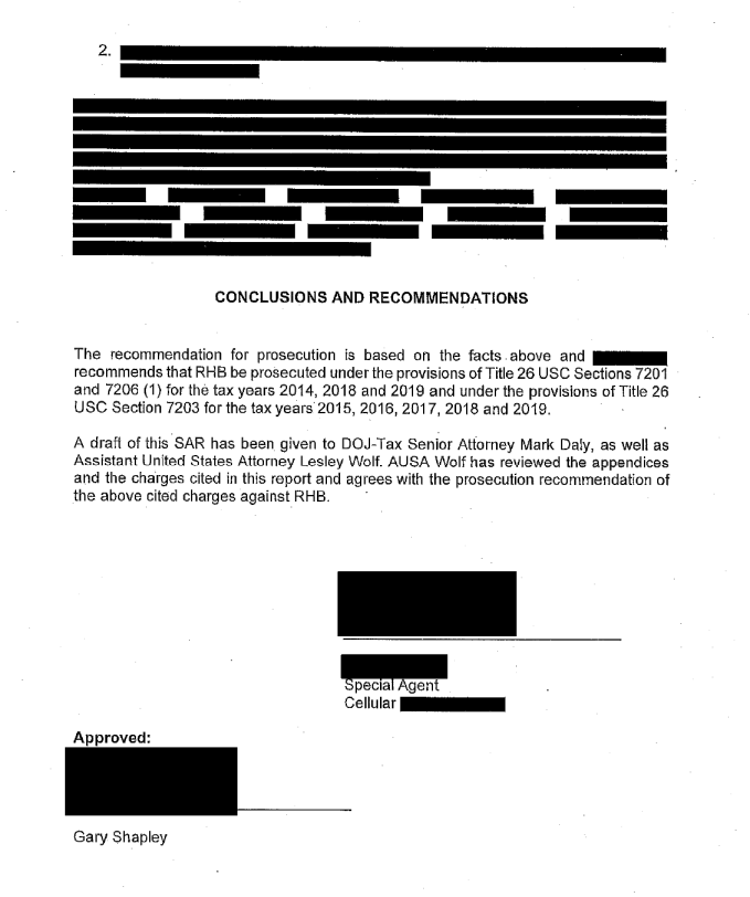 "AUSA Wolf supported charging Hunter Biden for tax evasion and false return in 2014, 2018, and 2019, and failure to file or pay for 2015, 2016, and 2017. It is my understanding that the Tax Division then authored a 90-plus-page memo that recommended prosecution"