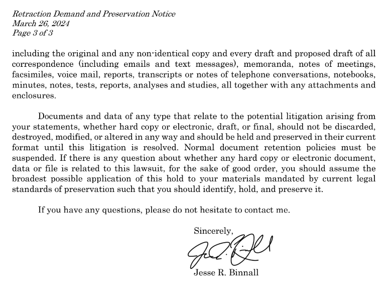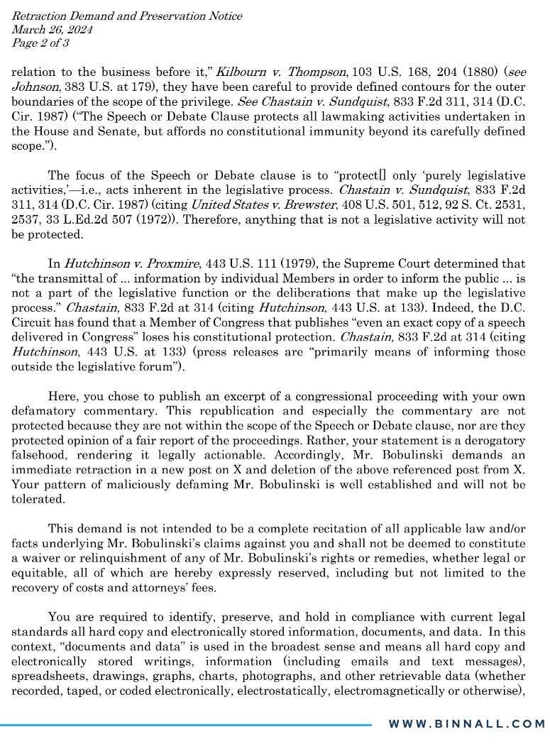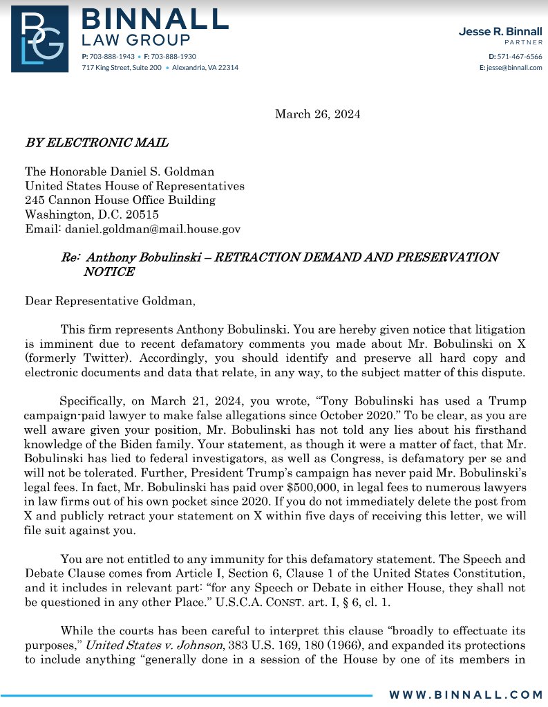 Tony Bobulinski lawyer @jbinnall issues retraction demand and preservation notice to Rep. Dan Goldman, threatening to file suit for defamation. The letter reads in part: You are hereby given notice that litigation is imminent due to recent defamatory comments you made about Mr. Bobulinski on X (formerly Twitter). Specifically, on March 21, 2024, you wrote, “Tony Bobulinski has used a Trump campaign-paid lawyer to make false allegations since October 2020.” To be clear, as you are well aware given your position, Mr. Bobulinski has not told any lies about his firsthand knowledge of the Biden family. Your statement, as though it were a matter of fact, that Mr. Bobulinski has lied to federal investigators, as well as Congress, is defamatory per se and will not be tolerated. Further, President Trump’s campaign has never paid Mr. Bobulinski’s legal fees. In fact, Mr. Bobulinski has paid over $500,000, in legal fees to numerous lawyers in law firms out of his own pocket since 2020. If you do not immediately delete the post from X and publicly retract your statement on X within five days of receiving this letter, we will file suit against you.