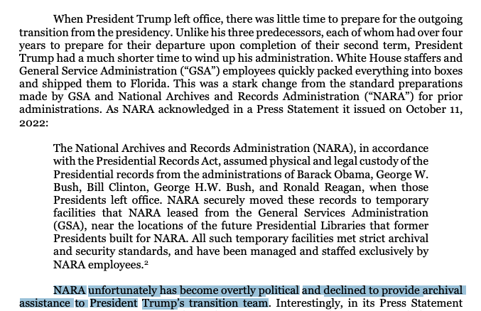 So NARA didn't assist Trump's team in archiving documents during the transition -- unlike it did for the five prior presidents -- then made a criminal referral over the documents it didn't assist in archiving? https://s3.documentcloud.org/documents/23789802/read-trump-lawyers-letter-to-congress-reveal-foreign-leader-briefings-may-be-among-classified-documents-taken-from-white-house.pdf#page=2… https://s3.documentcloud.org/documents/23789802/read-trump-lawyers-letter-to-congress-reveal-foreign-leader-briefings-may-be-among-classified-documents-taken-from-white-house.pdf#page=2