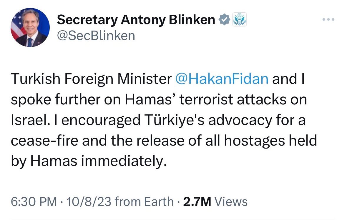 10/8/23: Sec. of State Antony Blinken likewise tweets and then quickly deletes post encouraging Turkey’s “advocacy for a cease-fire” https://x.com/RobbieGramer/status/1711366571665342603?s=20 State Dept. would reportedly issue a directive barring such rhetoric in public statements, but within months wholly obliterate that order https://www.huffpost.com/entry/state-department-internal-emails-gaza-israel_n_65296395e4b0a304ff6ff95d