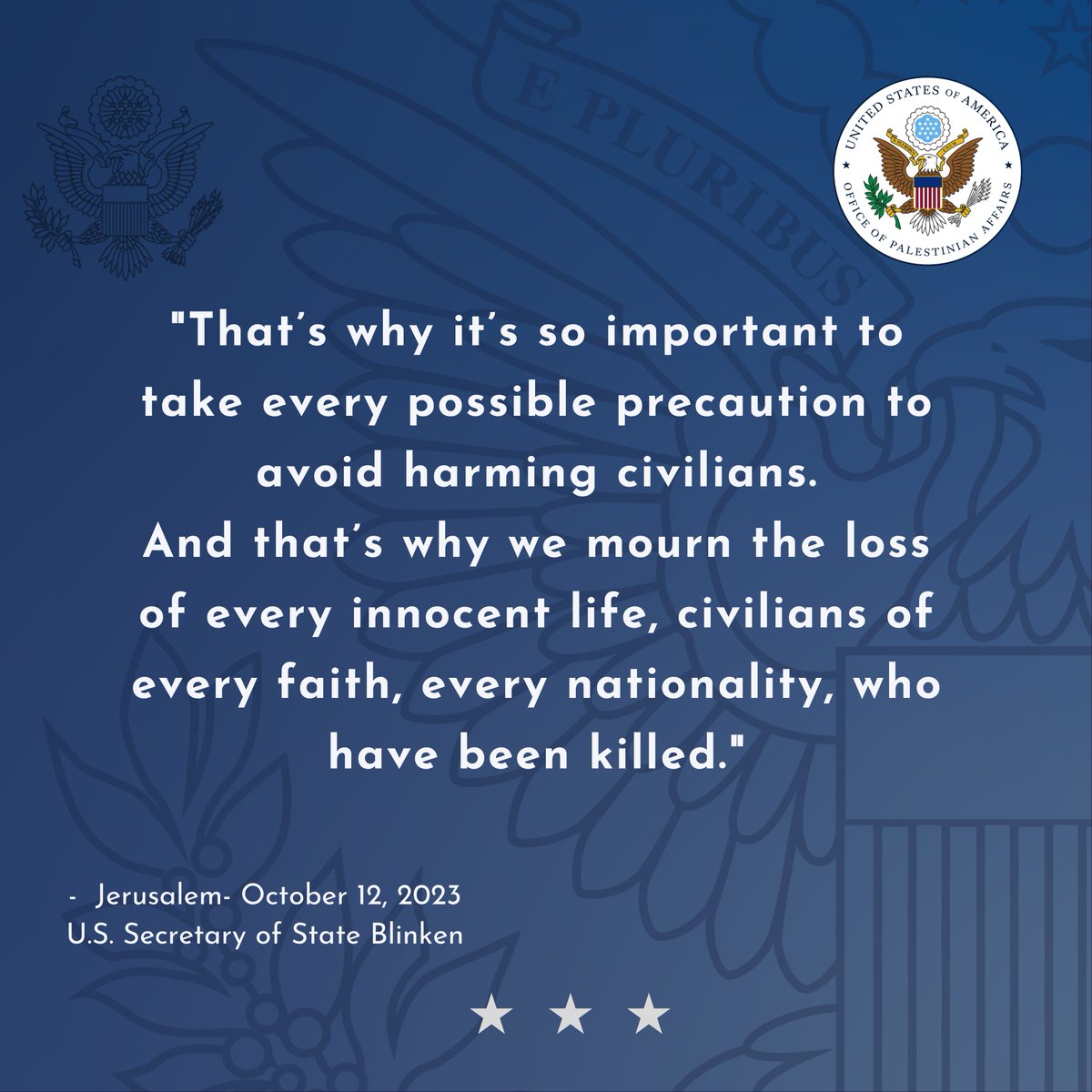 11/10/23: Sec. Blinken says that “Far too many Palestinians have been killed. Far too many have suffered these past weeks…we’ll be continuing to discuss with Israel the concrete steps to be taken to advance these objectives [preventing civilian harm and maximizing aid]” https://www.yahoo.com/news/blinken-brings-notable-shift-us-191932122.html