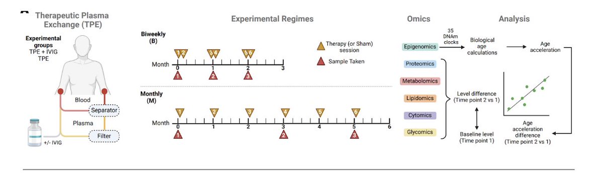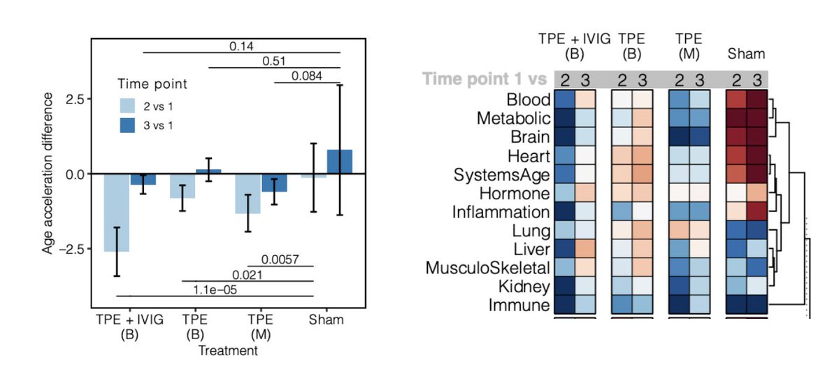 1/ A pre-print aimed to test the effect of different TPE protocols on 36 various epigenetic aging clocks caught our attention. Three TPE protocols were compared: 1) Monthly Protocol: TPE with 5% albumin, once a month. 2) Bi-weekly protocol: 2x TPE with 5% albumin in one week, followed by 3 weeks break. 3) BI-weekly protocol with IVIG: same as 2 in addition to 20g of IVIG following each TPE session. IVIG: Intravenous immunoglobulin is a plasma-derived pooled anti-body, which helps to bolster the immune system and prevent infections following TPE by offering a general replacement of the antibodies removed with the TPE. Offers protection following TPE, additionally the immune modulation can boost the biological rejuvenation measured in the blood immune cells PBMCs.