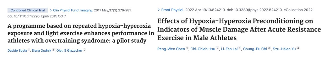 5/ IHHT preconditioning reduced muscle damage following intense resistance training Double-blind, randomized, crossover study involving 11 young male athletes. Intervention (Pre-exercise): Participants completed either a Normoxia (N) trial or a Hypoxia–Hyperoxia (IHHT) trial. Normoxia: Participants breathed air with 21% oxygen. IHHT: Participants alternated between hypoxic (10% O2) and hyperoxic (99% O2, HBOT level) air for 5 minutes each, totaling 60 minutes. Exercise: Thirty minutes after preconditioning, participants performed acute bouts of resistance exercise (RE) consisting of bench press, deadlift, and squats. Each exercise involved 6 sets of 10 repetitions at 75% of their one-repetition maximum (1RM), with 2 minutes of rest between sets. Washout Period: A 2-week washout period followed, after which participants crossed over to the other intervention. Key findings Muscle soreness and damage (indicated by CK and Mb levels) were significantly lower post-exercise following IHHT preconditioning compared to normoxia. The inflammatory marker IL-6 was higher with IHHT, possibly as part of the hypoxia-hyperoxia stress response.