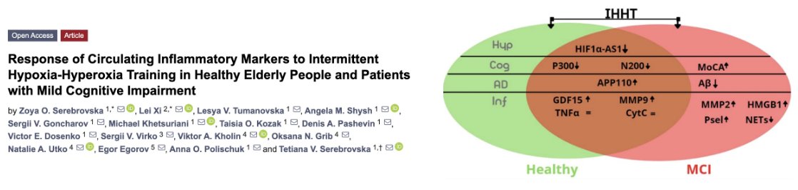 6/ Brain rejuvenation and cognitive enhancement Study design and conditions Participants: 13 healthy individuals and 16 with mild cognitive impairment (MCI). Protocol: 3 weeks, 4 weekly sessions. Session Structure: Alternating 5-minute intervals: four at 12% O2 (hypoxia) and three at 33% O2. Key findings In both healthy and MCI participants: Brain rejuvenation: Increased APP110 was observed. Improved vascular and tissue repair and regeneration: Increased MMP9 and MMP2 levels were noted. Decreased systemic inflammation: Lower NETs were found. In MCI participants: Reduced amyloid beta expression. Slowed cognitive decline and maintained faster reaction times. Potential stress-response: The IHHT protocol increased circulating GDF-15, indicating a mitochondrial stress response. A transient increase in GDF-15 can signify protocol efficacy, whereas a chronic increase is associated with aging and frailty.