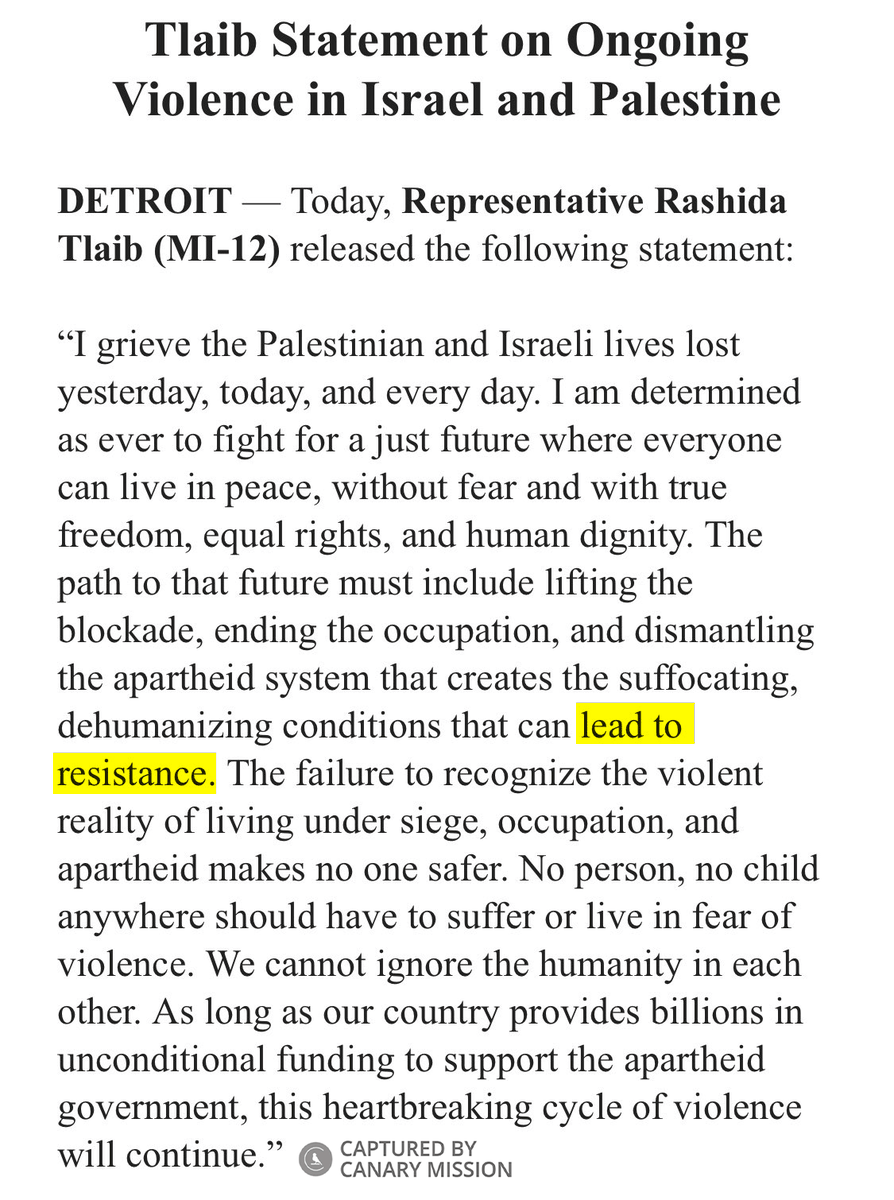 5/One day after the unprecedented massacre of 1,400 Israelis by Hamas, Tlaib released a statement condemning Israel for Hamas' war crimes, referring to it as "resistance." Tlaib later released another accusing Israel of war crimes for targeted hits of Hamas in Gaza. https://t.co/iFOxRaQOAH