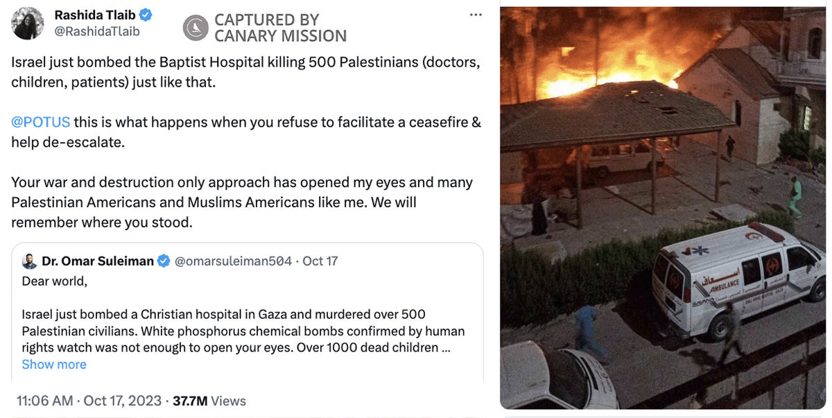 6/On October 17, 2023, Tlaib tweeted the debunked claim: “Israel just bombed the Baptist Hospital killing 500 Palestinians (doctors, children, patients) just like that." Although this claim has been completely falsified, including by POTUS, the tweet still remains on her feed. https://t.co/Qr8kCJedV2
