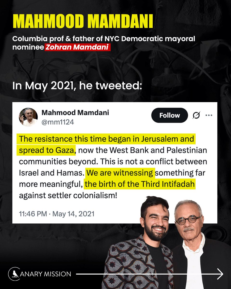 Mahmood Mamdani, Columbia professor and father of NYC Democratic nominee Zohran Mamdani, has glorified suicide bombings and praised the intifada. He called the suicide bomber “a modern soldier” and hopes for a Third Intifada. He promotes BDS and calls Israel a “colonial power” — using his influence at Columbia. This is the ideology Zohran was raised around.