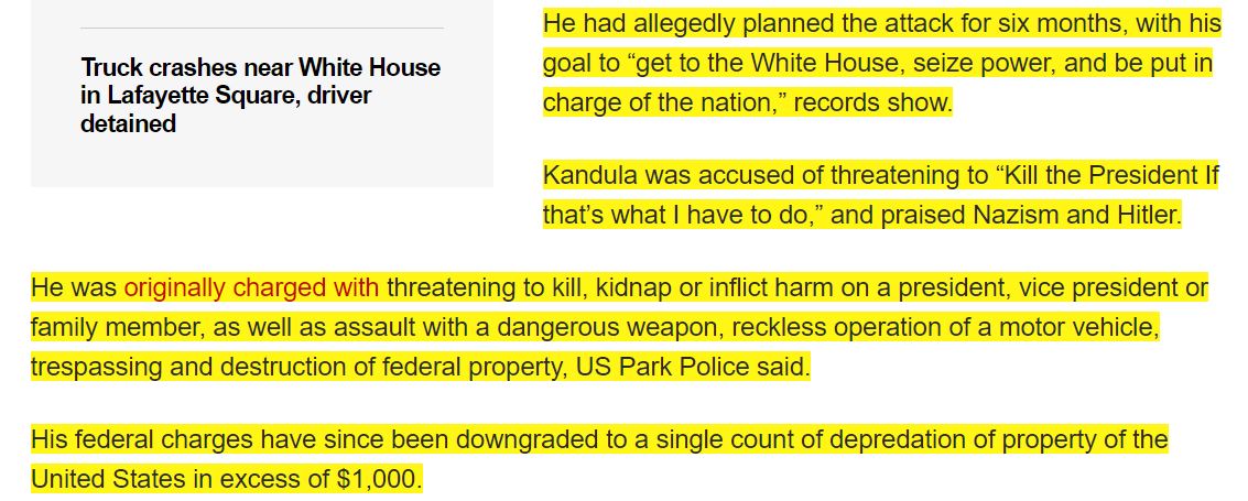 So let me get this straight: Sai Kandula planned, for 6 mnths, to take over our nation and "kill the President" if necessary, and had a Nazi flag in his U-Haul (most dangerous domestic threat!) that he crashed outside the WH. And the DOJ DOWNGRADED his charges to "depredation…
