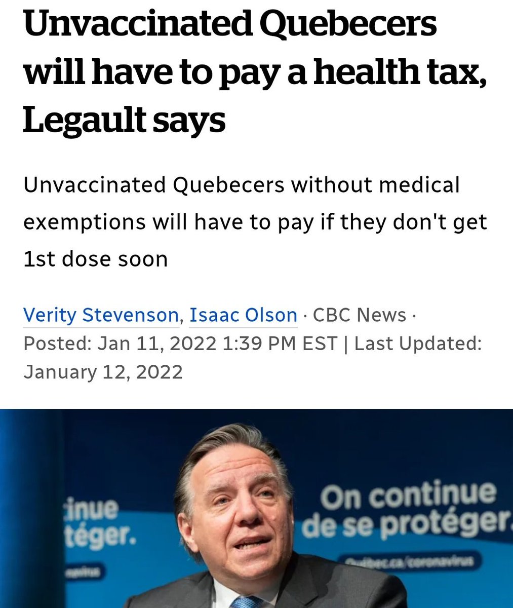 Reminder that Quebec threatened the unvaxxed with a health tax and called them a burden on the healthcare system. But no one was coerced, right? π https://t.co/1ODjtUaULD