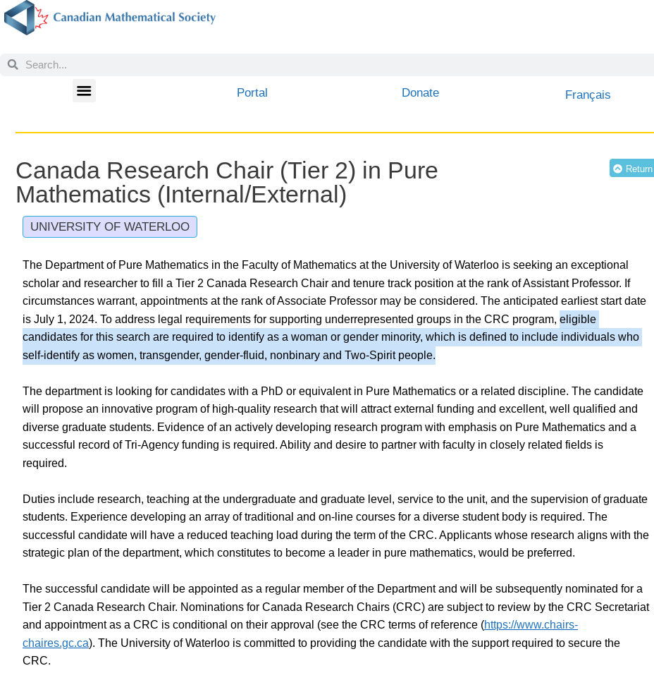 The Department of Pure Mathematics at @UWaterloo is hiring a math professor. ''Eligible candidates for this search must self-identify as women, transgender, gender-fluid, nonbinary and Two-Spirit people.''