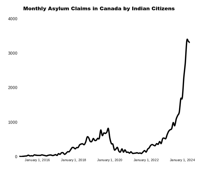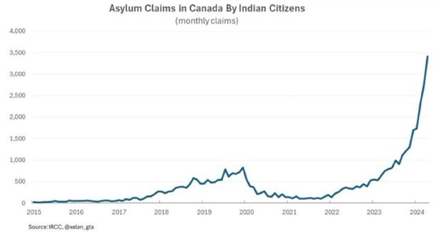 This chart went viral, so I downloaded the data straight from the Canadian government to verify it. Sure enough, the spike is real. It appears that Indians have discovered a loophole in the asylum process—and they’re taking full advantage of it.