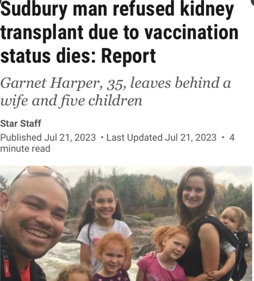 This is the most evil story I can remember from Covid. His name was Garnet Harper. Canada killed this 35-year-old father of 5 because he refused to get vaccinated. After denying him a kidney (he had 2 of them lined up from his brothers, so he wouldn't be taking another donee's spot), while he languished on his death bed, the hospital asked his wife to contribute his organs to the cohort of the vaccinated. “They call you while you’re sitting next to your dying loved one and they ask you if they can have his organs,” said his wife. “Meanwhile, he wasn’t good enough to receive organs from them… I can’t describe the feeling … It makes me sick to my stomach.’’