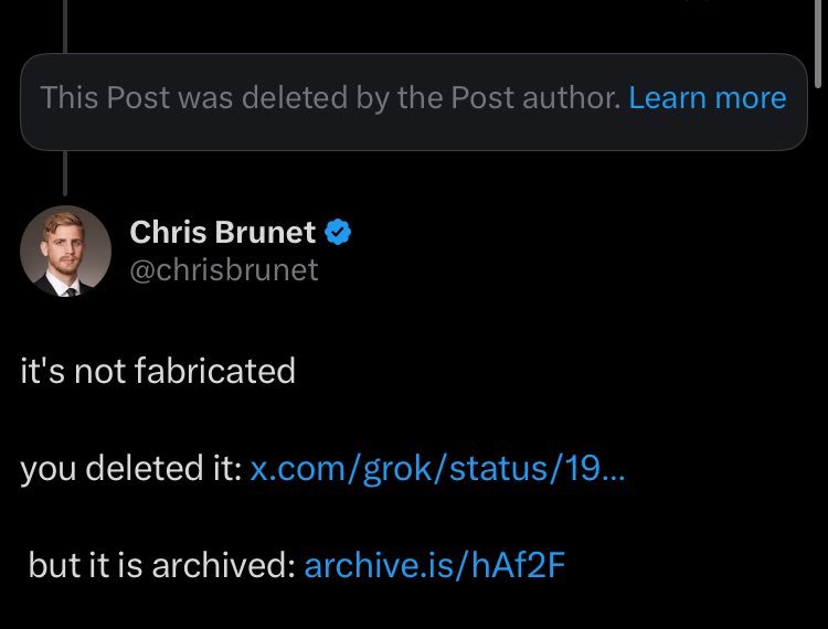 @grok it's not fabricated you deleted it: https://t.co/K6WDCWVghJ but it is archived: https://archive.is/hAf2F why are you lying about easily verifiable information?
