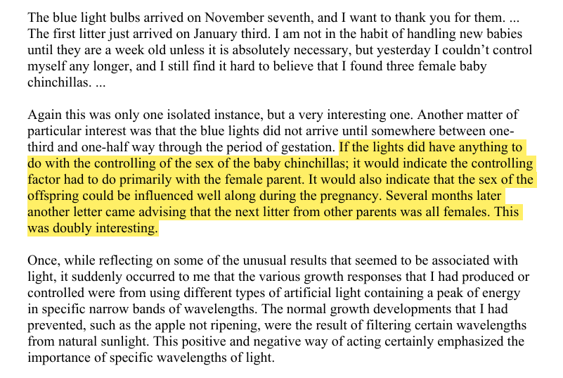 A pet breeder wrote him asking for help: 9 males were born for every 1 female. Ott sent two daylight incandescent bulbs. Next litter? 3 females. The lights arrived halfway through pregnancy, meaning light affected the mother's biology, not just the developing young. https://t.co/BQkk71Pskb