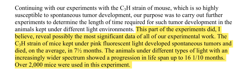 The cancer experiments were the most striking. Mice under pink fluorescent light developed tumors in 7.5 months. Mice under full-spectrum light took 16.1 months, more than double. Over 2,000 mice tested. The only difference was the light they lived under. https://t.co/WtUG0LzDtB