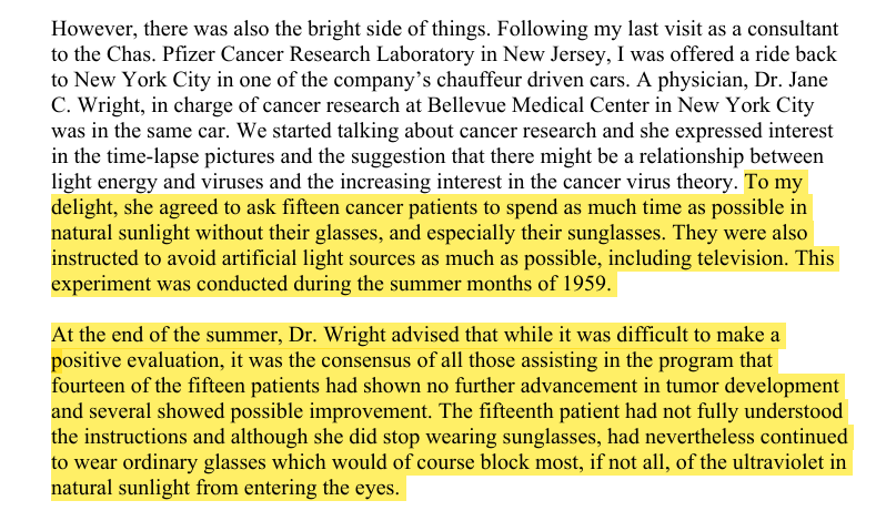Then the human trial. 1959, Bellevue Medical Center: 15 terminal cancer patients. Instructions: No artificial light & maximum outdoor time w/ no sunglasses. 14 of 15 showed no tumor progression over the summer. The experiment was never repeated. Dismissed as "unscientific." https://t.co/UABgyKqG5L