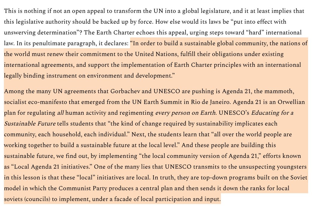 Pay particular attention to #4. "4. Create a new system of governance based on local decision-making within the framework of international agreements." Get it now? "create a NEW system based on LOCAL decision-making WITHIN... INTERNATIONAL AGREEMENTS". https://themarshallreport.wordpress.com/2016/06/27/are-you-ready-to-leave-the-u-n-and-their-agenda/amp/?fbclid=IwAR079nIFMkxRbu3xwZbAxvcmjheQOP2l_noekbBRV6ka2OP3CMiGscZH-ns&__twitter_impression=true