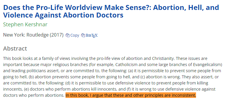 He's argued that being religiously pro-life doesn't really make sense. How can abortion be killing and it still be wrong to harm abortion doctors? Something doesn't add up! https://t.co/5Lk9tWbTg7