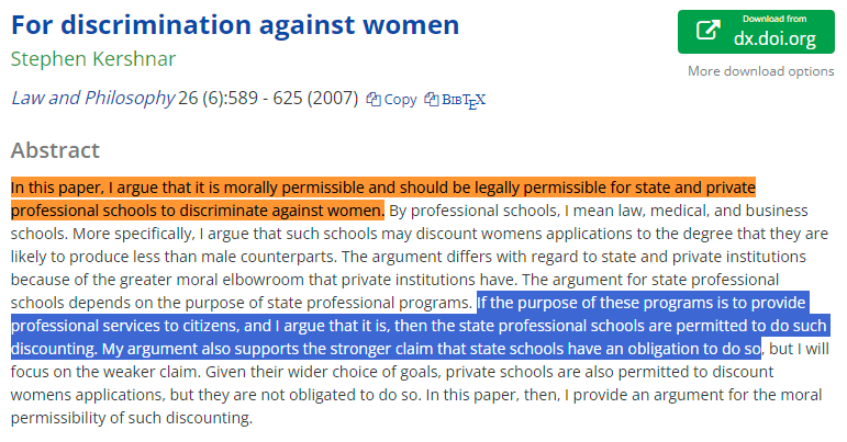 One of his contributions is the idea that it is morally permissible to discount women's applications. Indeed, the strong form of this argument says that people are obligated to discriminate against women. https://t.co/nyDu5WkrVc