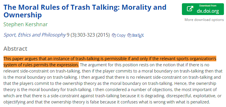 He sometimes delves into heavy topics, like the conditions under which trash talk is moral and permissible. https://t.co/QuQfr6XO2C