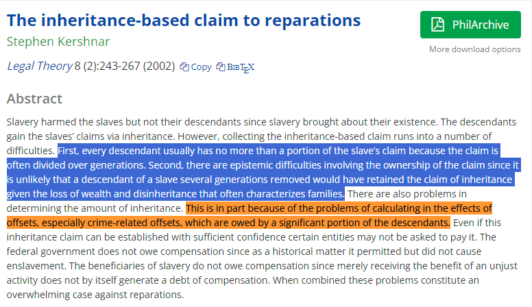 Speaking of slavery, he's also talked about reparations. TL;DR: no one owes them; it's not clear who inherits the right to them; if said right existed, it's dispersed among many and it's less plausible with each generation; and since slave descendants do a lot of crime... QED. https://t.co/pedukPYXCE