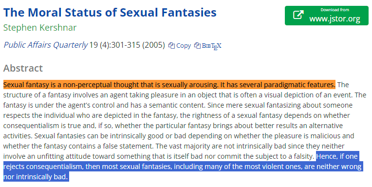 He's willing to argue that sexual fantasies—non-perceptual thoughts that are sexually arousing—aren't immoral, unless you're a consequentialist. https://t.co/JorMpPA6A0