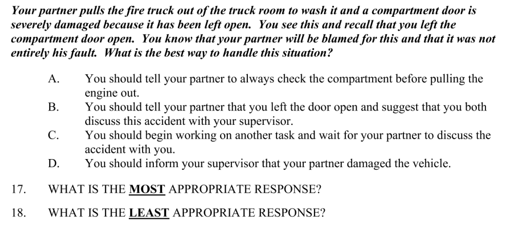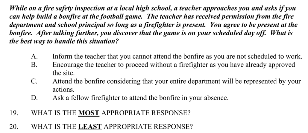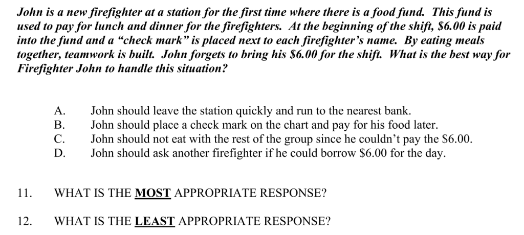 Lots of people are saying this is frivolous because firefighters should have to pass some test, but let's go ahead and look at some test questions so you can see why this test is just way too hard. This first one's a doozy: