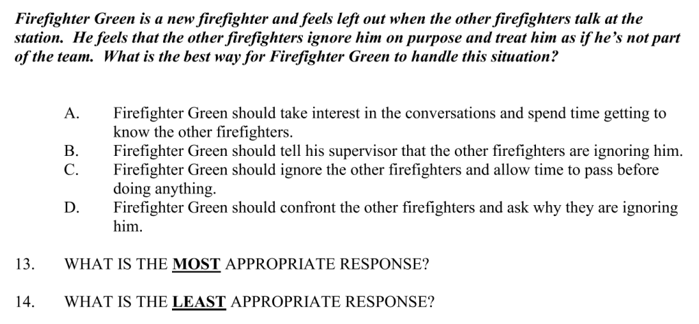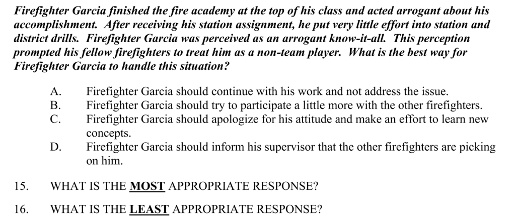 For this question, you'll appreciate that the exemplar is Hispanic, and thus this test is culturally inclusive. Anyway... is firefighter Garcia lazy and how can he not appear lazy to his coworkers?