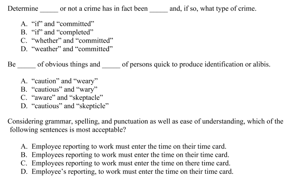 For the second-to-last section, you'll need to prove you can understand people's writing. For the first two, pick the words that best complete the sentence, and for the next one, pick the most acceptable sentence.