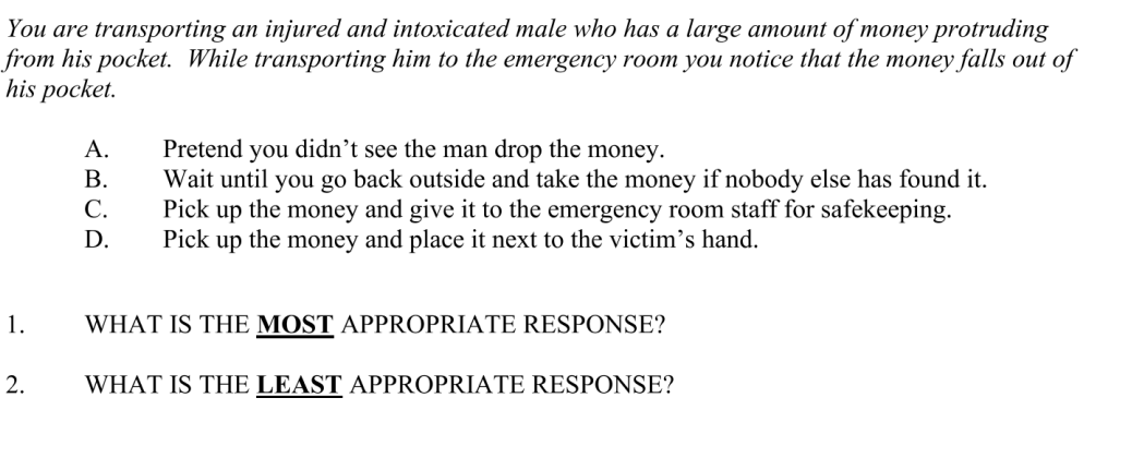 For the next section, we have to talk Human Relations. For this part, you're going to be presented with a scenario and some options, and you'll have to choose which of the options is the best and which is the worst possible response. For example: Should you steal from drunks?