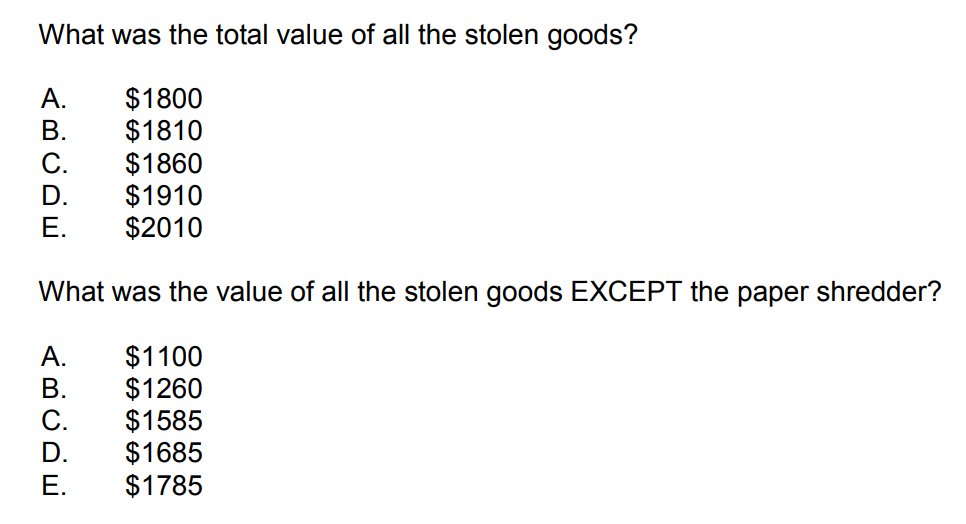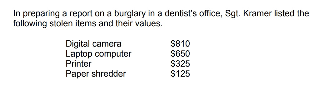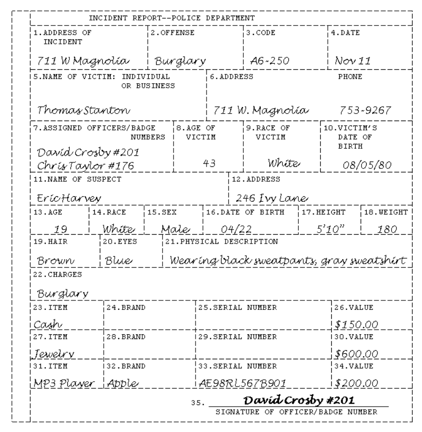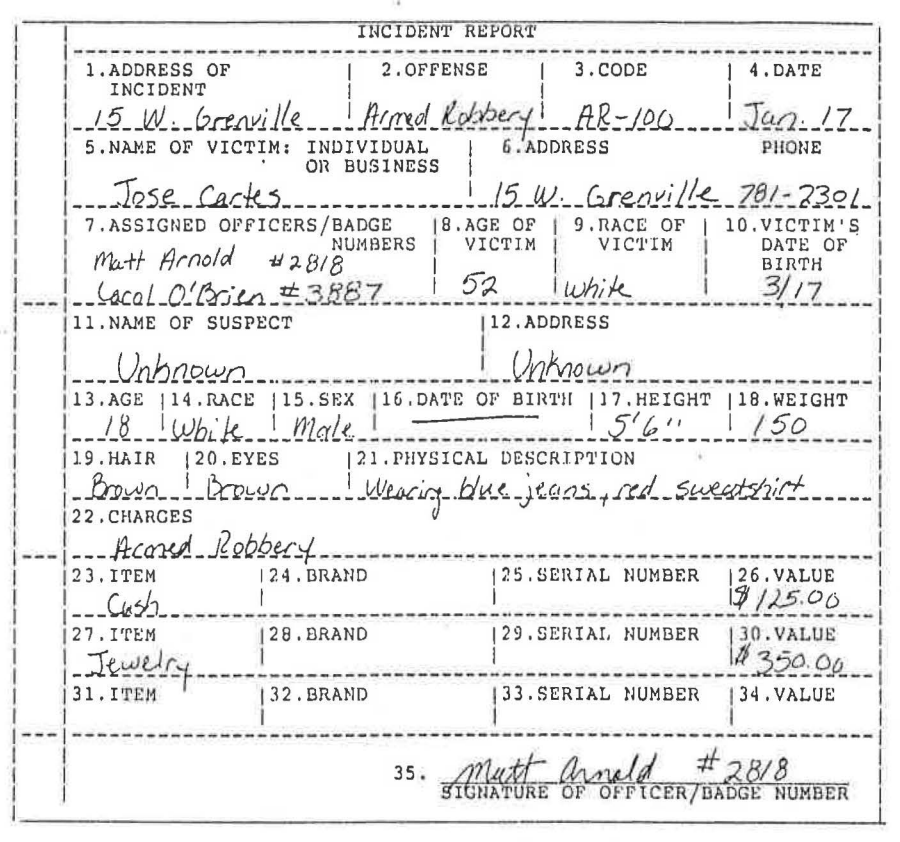 Then you have to write out when this incident took place, the name of the suspect, the phone number of the victim, the suspect's weight, and the value of the stolen jewelry. It's that simple. Got it?