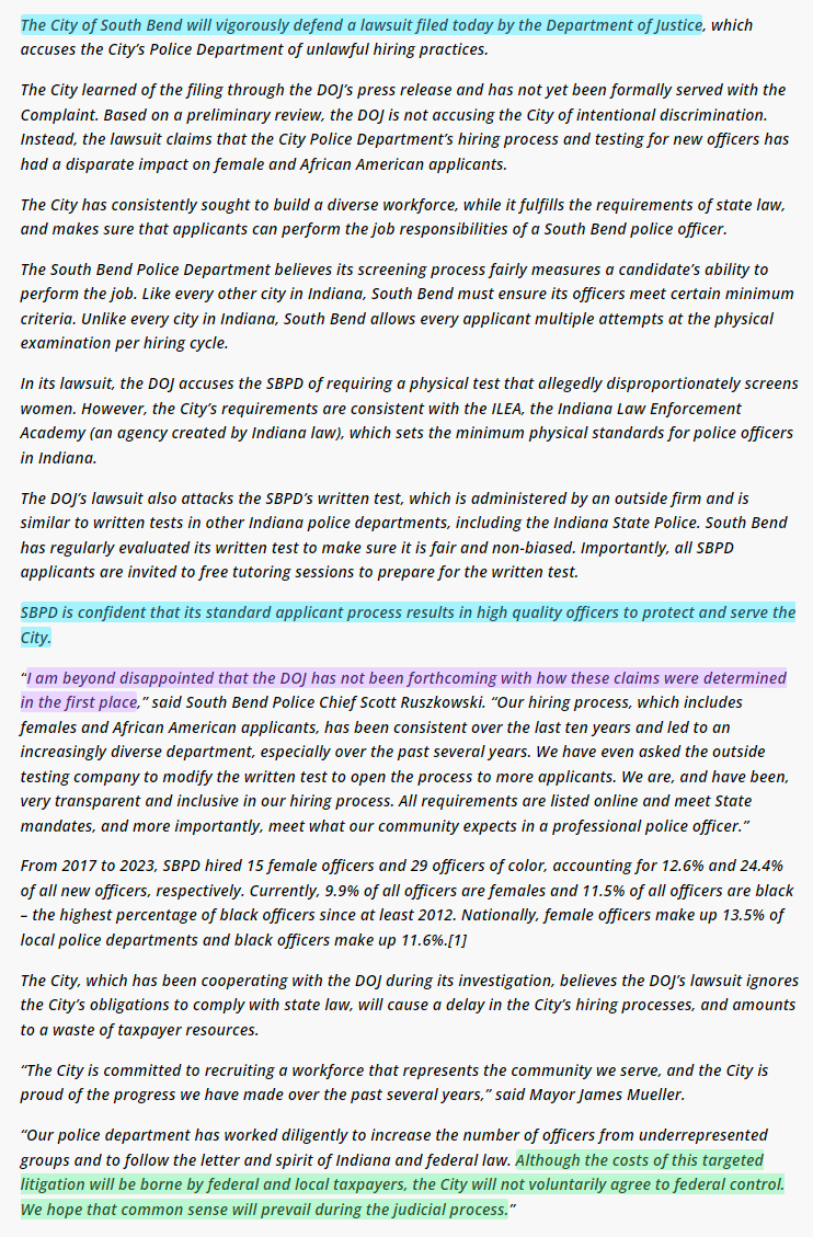Important detail: The test used in South Bend is the NPOST. The NPOST is developed by Stanards and Associates and endorsed by the Indiana Association of Police Chiefs. This test is used in many more departments nationally. The DOJ is thus, prepared to go after all of them.