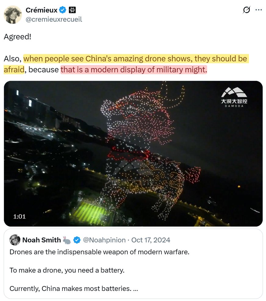When you see one of China's very impressive drone shows, what you are seeing is something that America needs, but doesn't yet have: Drone coordination. Due to regulatory issues, lack of domestic manufacturing, Chinese export controls, etc. America lags in the future of warfare.