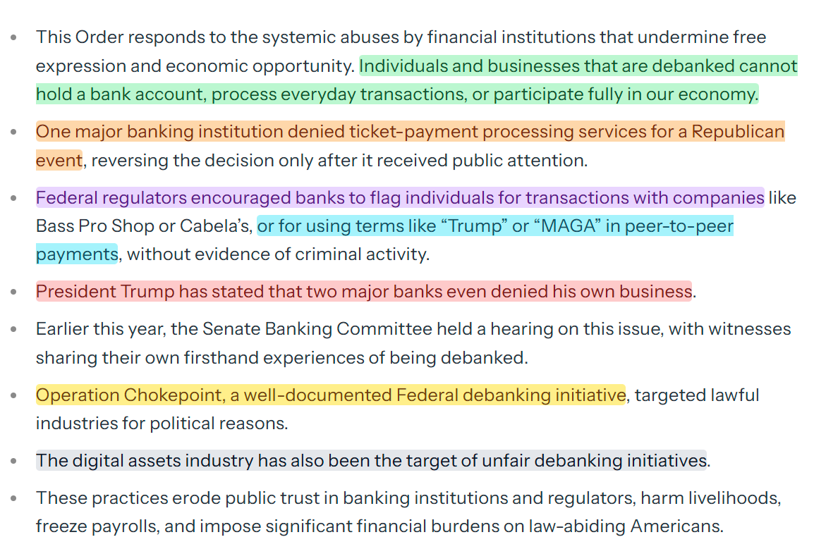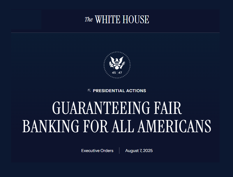 Debanking is a scourge, and this EO is the first step in ending it. If you want to read it, you can find it here: https://www.whitehouse.gov/presidential-actions/2025/08/guaranteeing-fair-banking-for-all-americans/