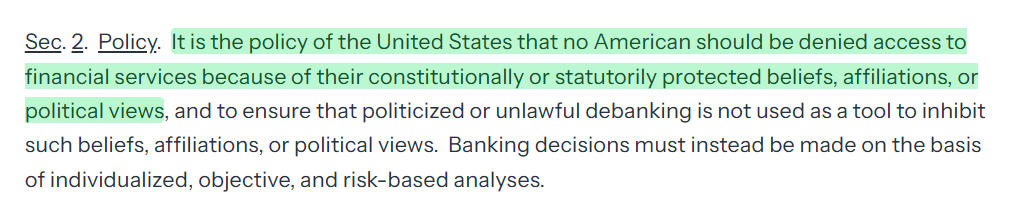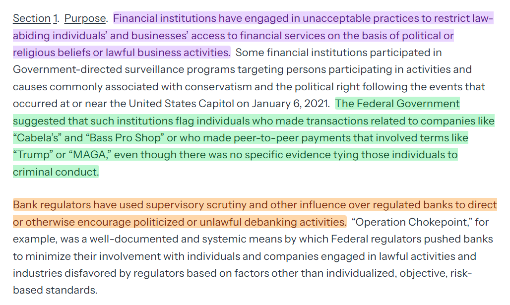 The executive order begins with some background: Americans, often at the behest of government officials, have been subject to the loss of access to financial services. That often meant having no access to bank accounts, debit and credit cards, investment tools, and so on.