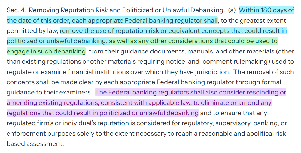 So, what happens first? Firstly, federal banking regulators will tell financial institutions to remove all material in their guidance that leads to debanking. Secondly, they will rescind regulations that encourage or expressly permit debanking.