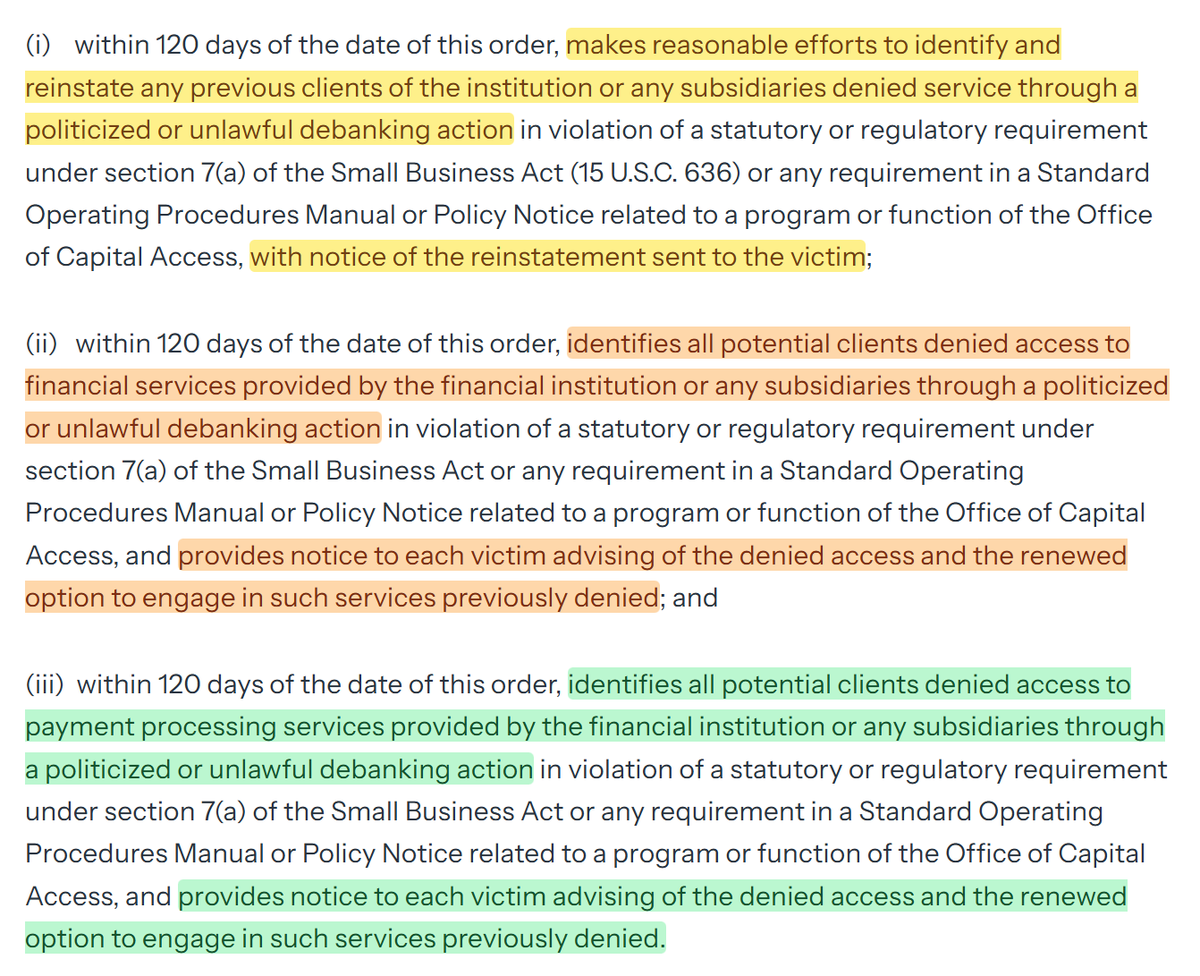 I would suggest they - Push prudential regulators to "flow down" non-discrimination through sponsor banks: strip reputational risk from exams and bake objective, risk-based non-discrimination clauses into third-party/fintech contracts, binding processor that rely on those banks. - Use SBA hooks like what this first EO details. - Coordinate a Treasury-led plan that recommends prudential guidance about sponsor-bank contracts, FTC UDAP enforcement for nonbank processors, and maybe do a Hill push to amend fair access to explicitly cover card networks and processors, not just banks. Current text already covers payment card networks, so it's easy to extend to money transmitters/payment facilitators. - Review and extend fair access concepts at the OCC and make them sticky downstream. A revived OCC fair access posture forces partner banks to keep serving lawful merchants and to require processors on their rails to do the same absent bona fide risk. - Do a procurement squeeze. Condition federal payment vendors and agency merchants on non-discrimination commitments. An EO back in March already forces agencies onto electronic payments. That reaches a subset of big processors doing federal work and a larger subset connected to it, but doesn't bind the whole market. Fast fact sheet is here: https://www.whitehouse.gov/fact-sheets/2025/08/fact-sheet-president-donald-j-trump-guarantees-fair-banking-for-all-americans/ And yes, the original EO includes FDIC, because it's a FSOC member agency. Imagine a bank losing FDIC coverage because they just really want to debank someone. That would be very unwise.