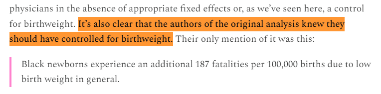 At this point, we have to ask ourselves why the original study didn't control for birthweight. One sentence in the original paper suggests the authors knew it was a potential issue, but they still failed to control for it.