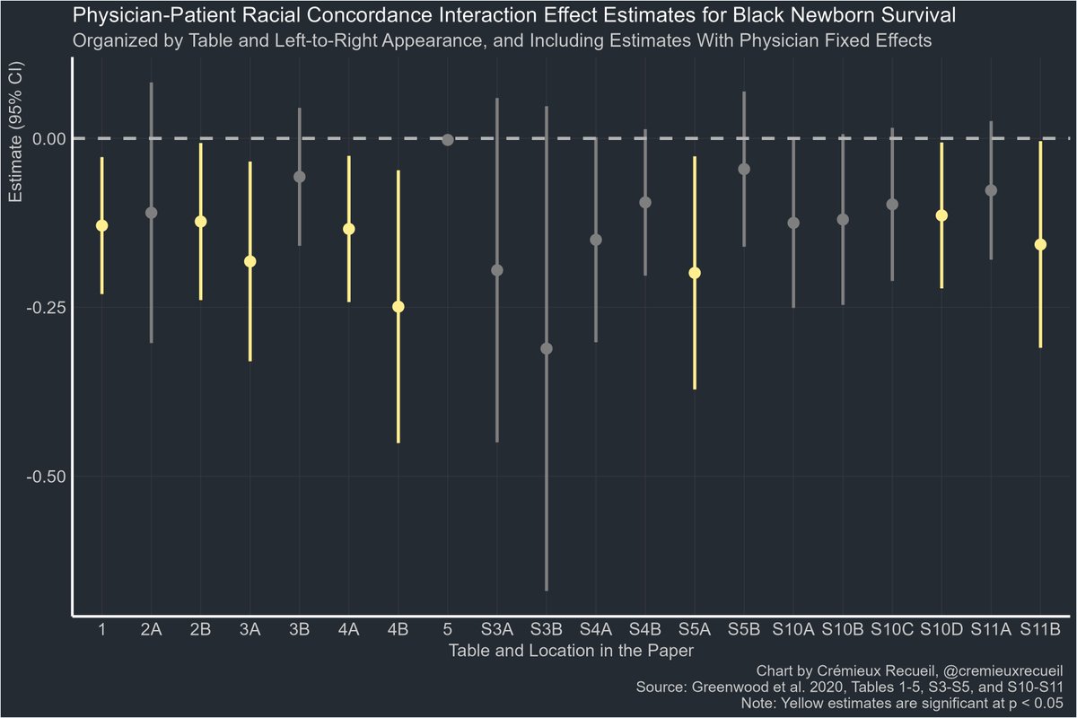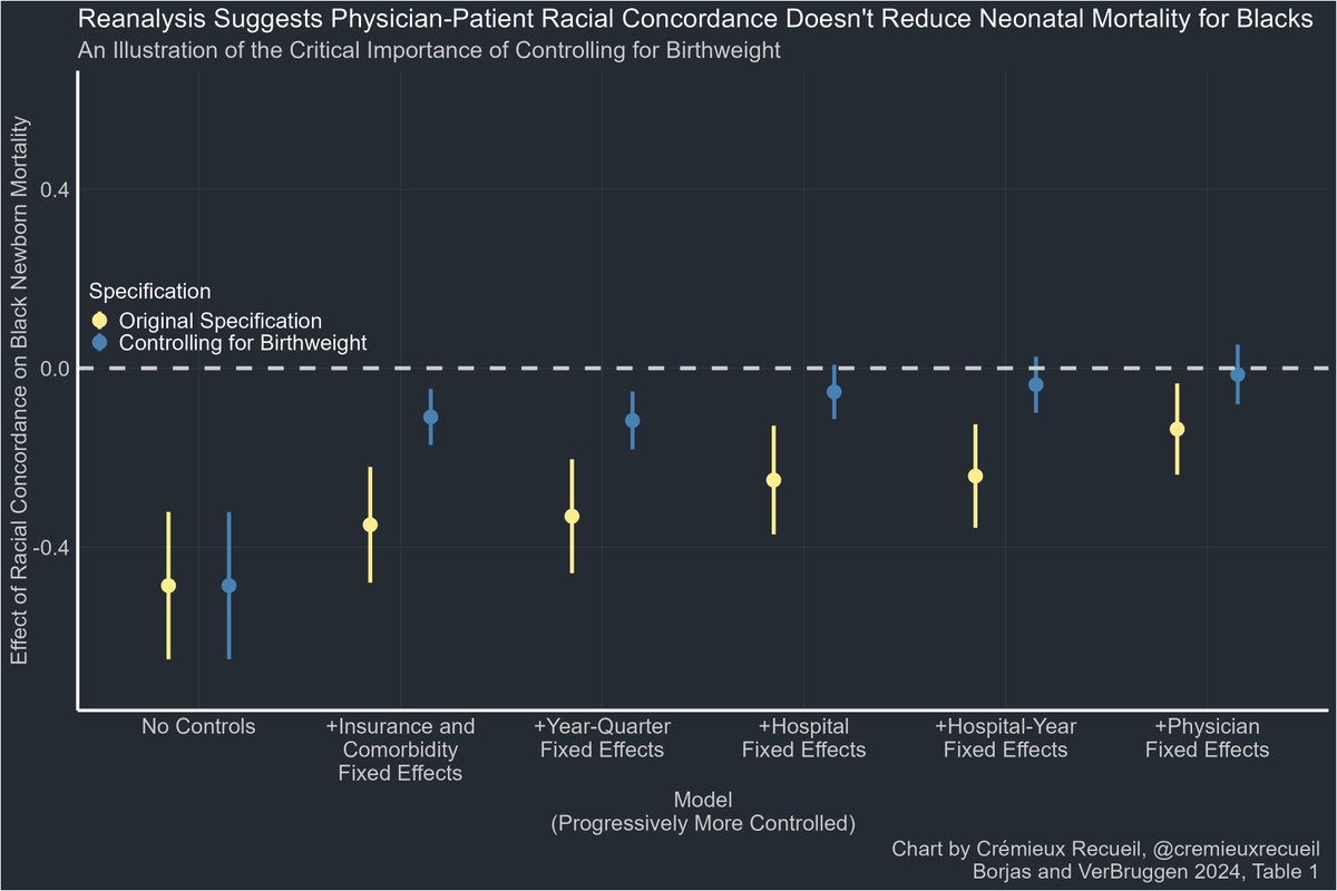 If you control for birthweight when running the original authors' models, two things happen. For one, they fit a lot better. For two, the apparently beneficial effect of patient-doctor racial concordance for Black babies disappears: