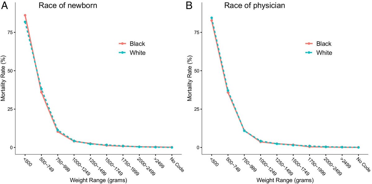 So, first thing: (A) At very low birthweights, babies have higher mortality rates, and they're similar across baby races; (B) At very low birthweights, babies have higher mortality rates, and they're similar across physician races.