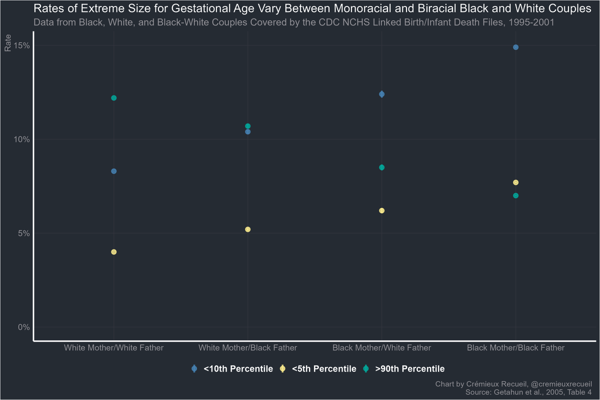 Second thing: Black infants tend to have lower birthweights. MIxed infants tend to birthweights in-between Blacks and Whites, and there's a mother effect, such that Black mothers have smaller mixed babies than White mothers (selection is still possible)