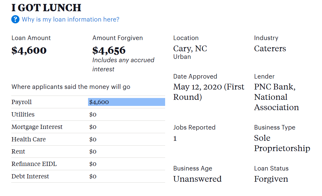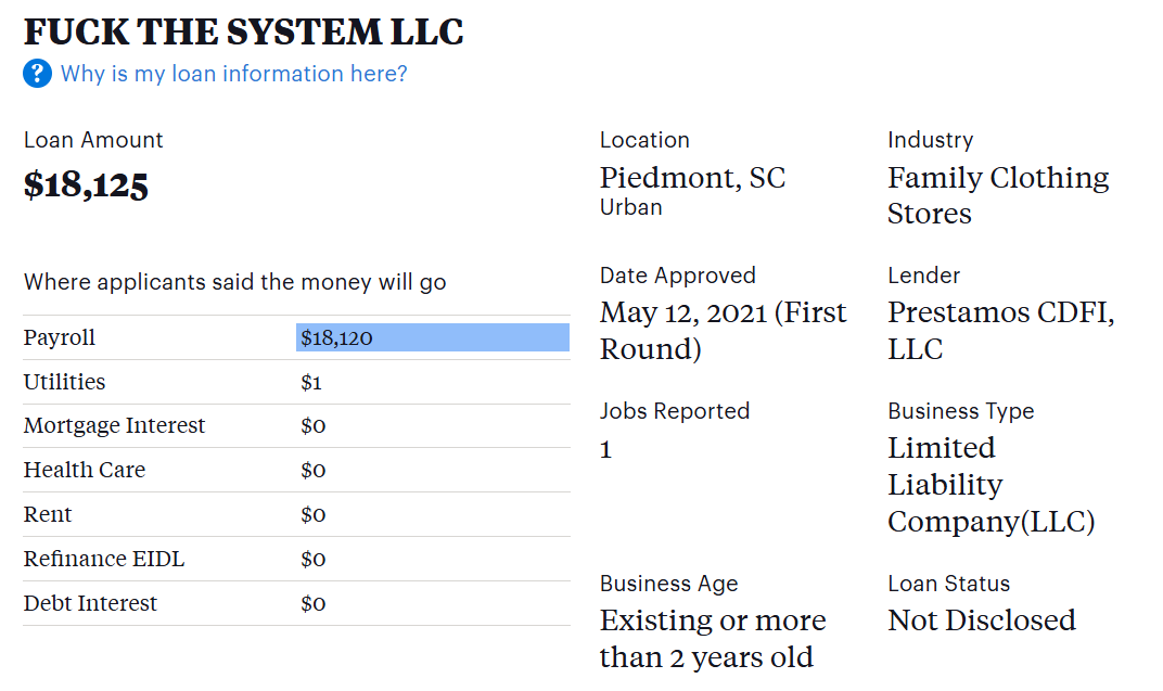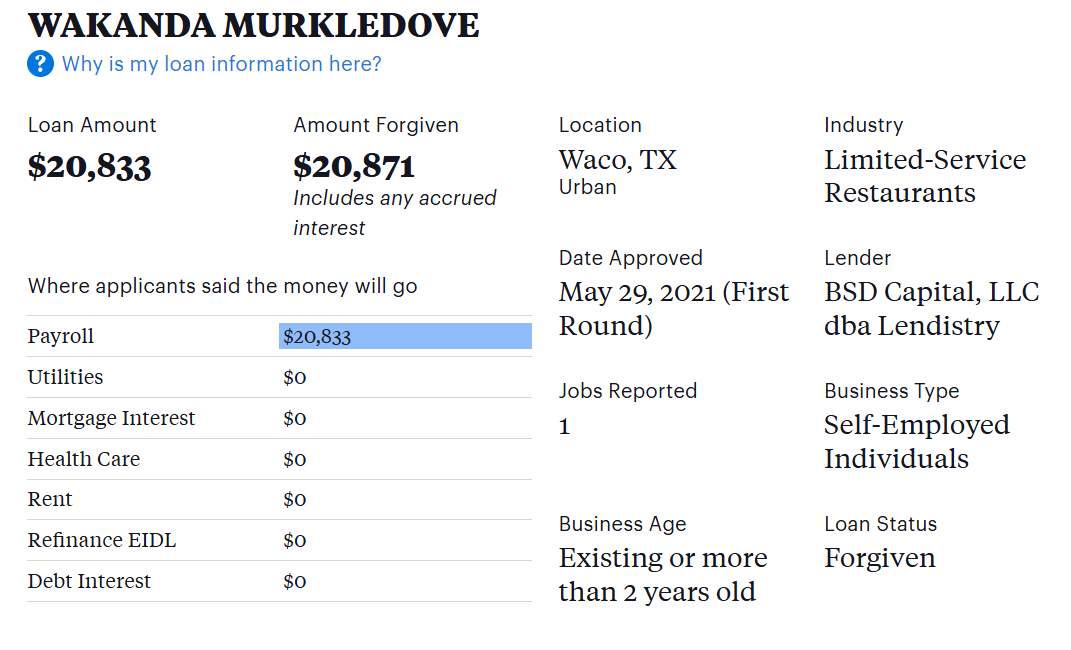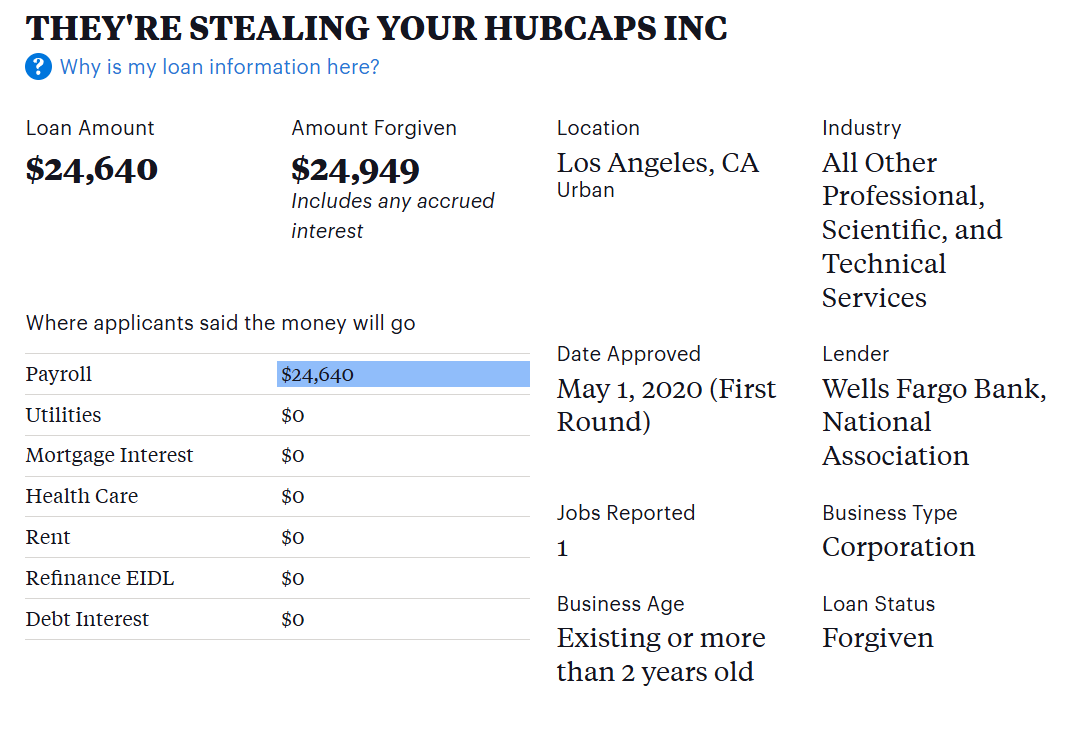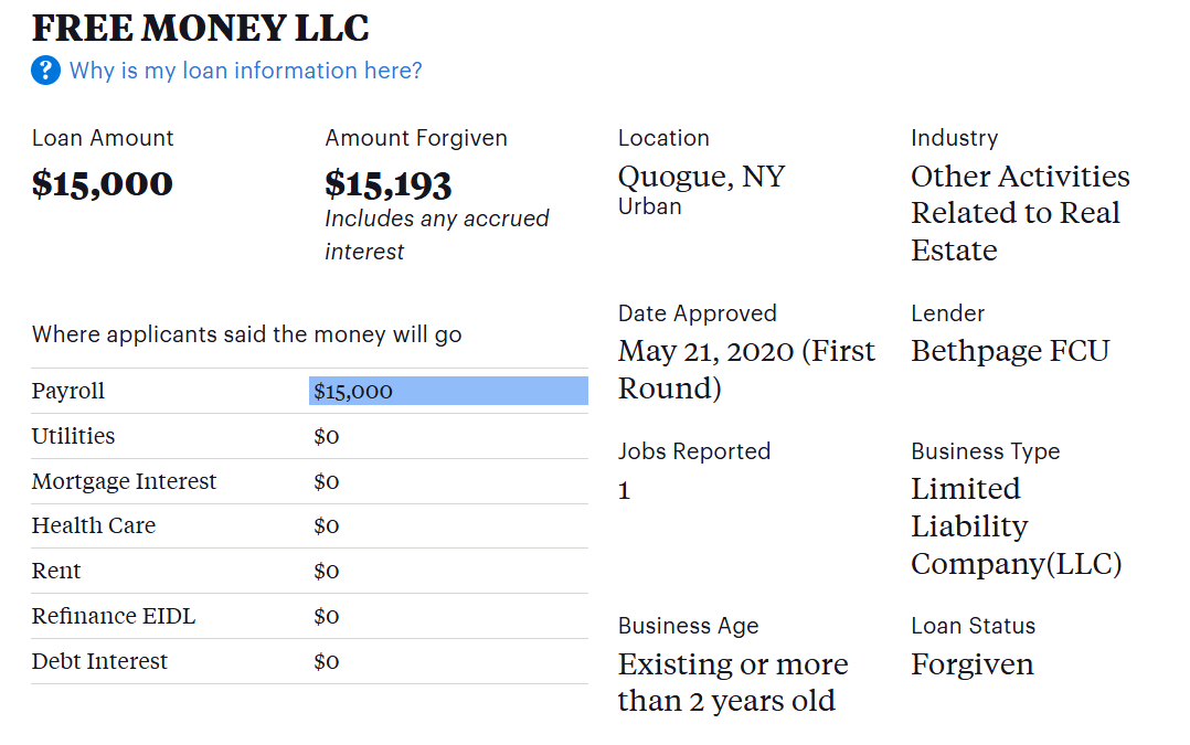 As a reminder in case you skipped over it, Free Money LLC had their loans forgiven. They got to keep that fraudulently obtained money. Feel like a sucker yet?