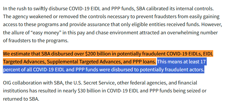 Here's the estimated scale of the fraud from the Office of Inspector General at the U.S. Small Business Administration: https://www.sba.gov/document/report-23-09-covid-19-pandemic-eidl-ppp-loan-fraud-landscape
