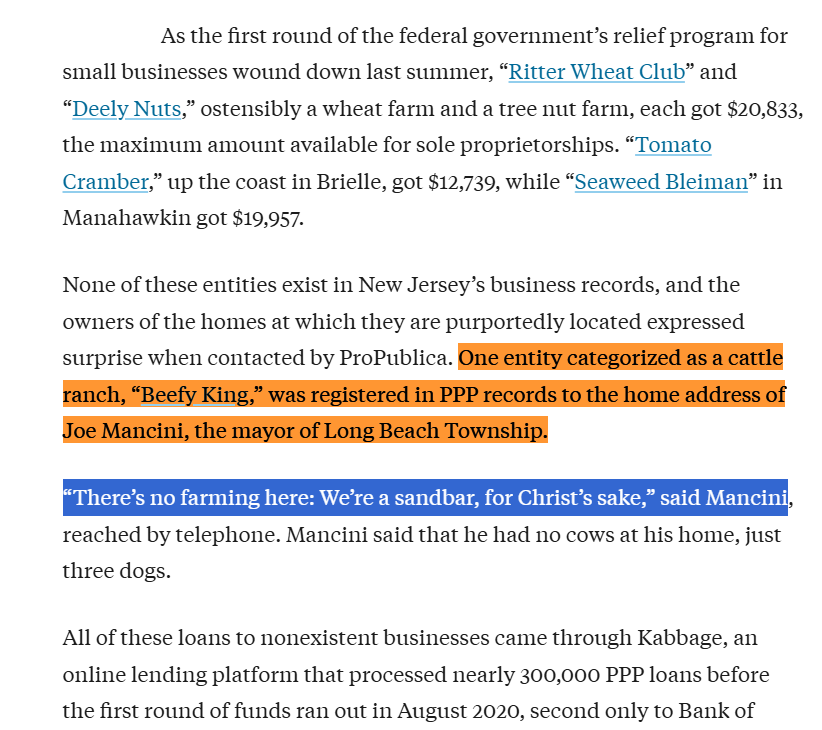 Here's a search tool if you want to look into this yourself: https://projects.propublica.org/coronavirus/bailouts/search?q=hellcat and h/t @ManDaveJobGood, who's been cataloguing so much of this. NBC: https://www.nbcnews.com/politics/justice-department/biggest-fraud-generation-looting-covid-relief-program-known-ppp-n1279664 Hellcat theft: https://jgdattack.eu/blog/en/hellcats-on-the-hunt-the-rising-theft-of-dodge-s-muscle-icons Crabs: https://www.seafoodnews.com/Story/1183203/ANALYSIS-King-Crab-Demand-Improving-During-Pandemic