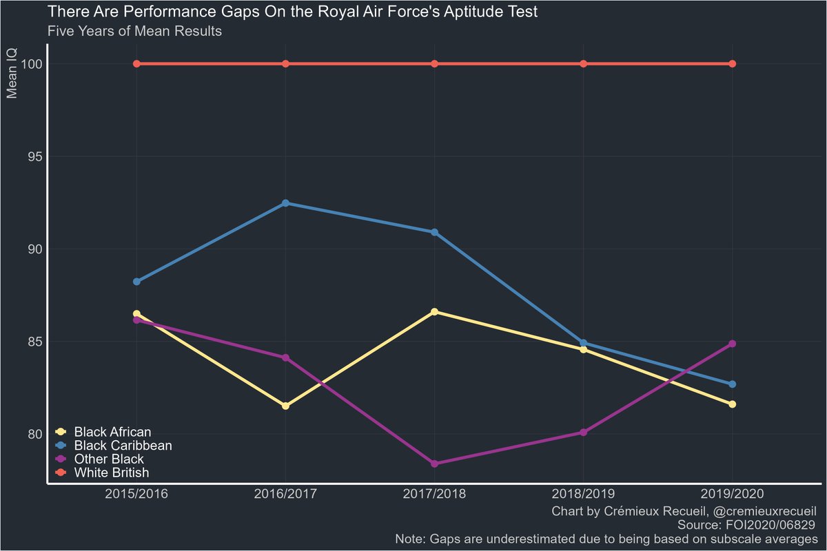 The RAF uses aptitude tests for recruits. A recent Freedom of Information request made the data for 2015-2020 available, and it looks like this: