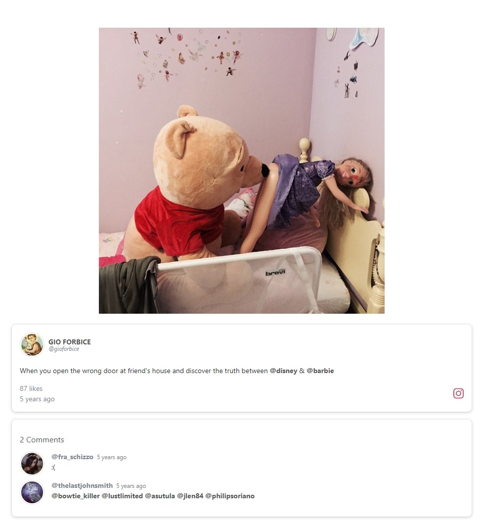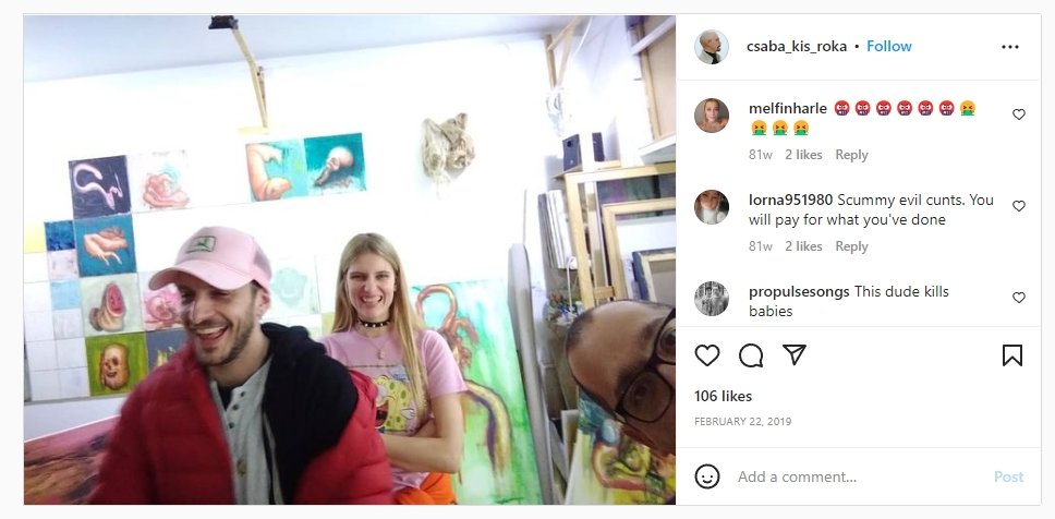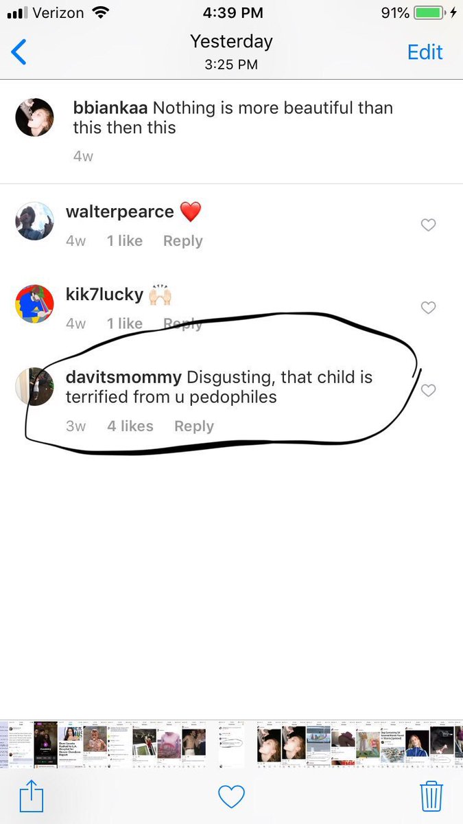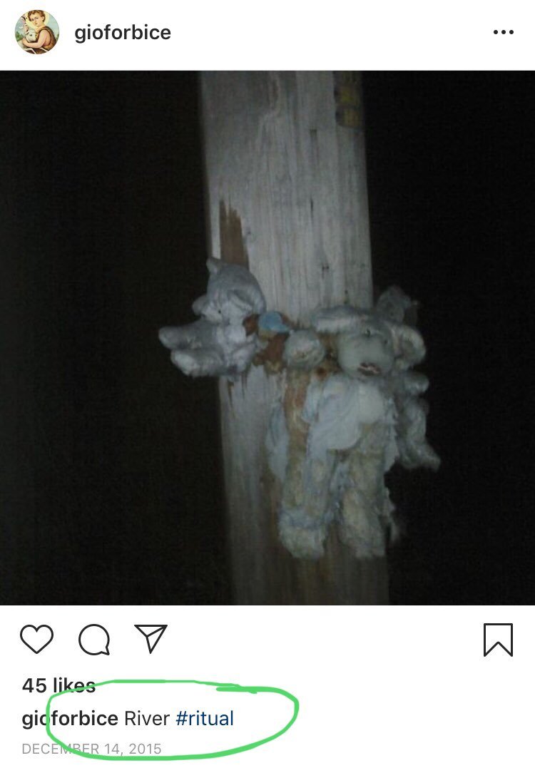 I mean she calls him Pedo babe, he got incredibly disturbing pics of children. Below we see what looks like bunch of teddy bears tied on a pole ? He writes River Ritual on the comments. I mean no wonder these 2 are a couple right ? I'm not sure if it's her on the pic to the right