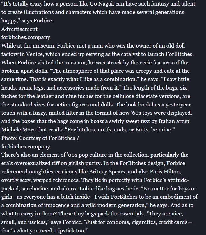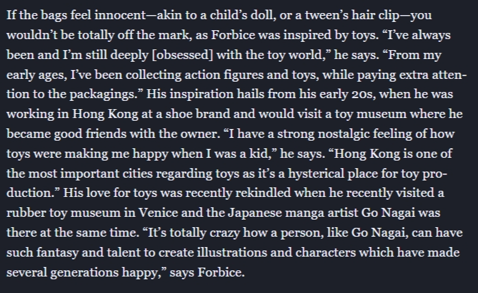 We can also see where he got some inspiration from as he really has a well interests for toys. This guy launched his own label ForBitches and it seems to have a market for it but are people aware of who designed the bags or styled PumaXFenty amongst other brands ?