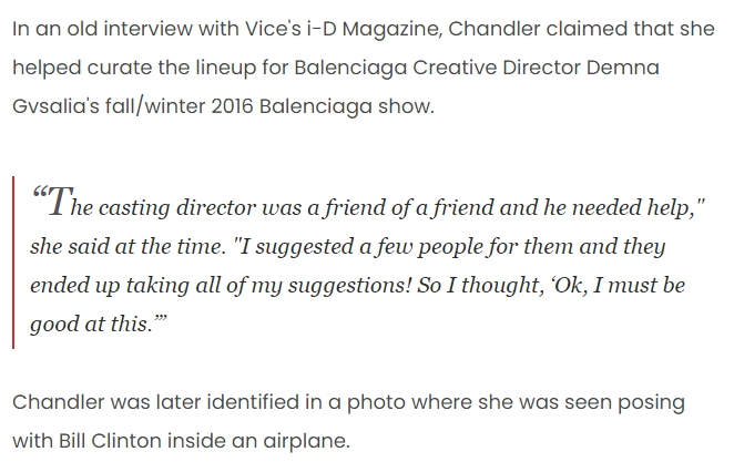 This picture has been circulating the internet, Rachel Chandler and Bill Clinton. The theory goes that's the Lolita Express Private Plane belonging to Epstein. However It's a theory and we won't focus on that. Rachel Chandler have worked w Balenciaga.