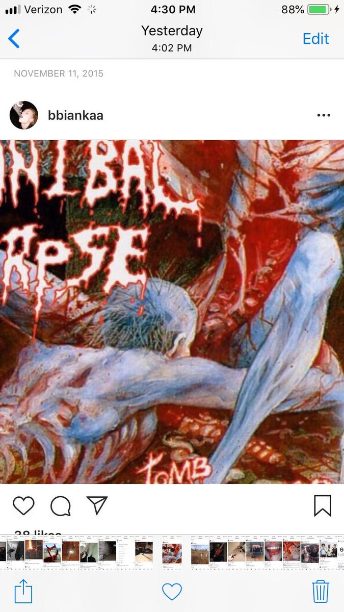 She is a fan of cannibal corpse just like Lotta Volkova, I'm really not sure what the carpet artwork is but it looks like some animal skin surely it can't be human.