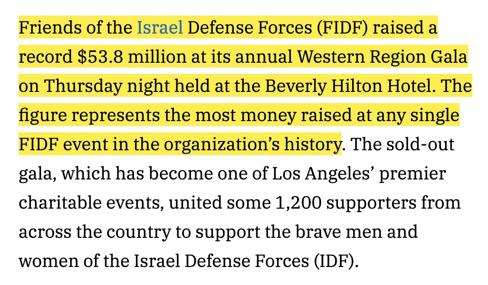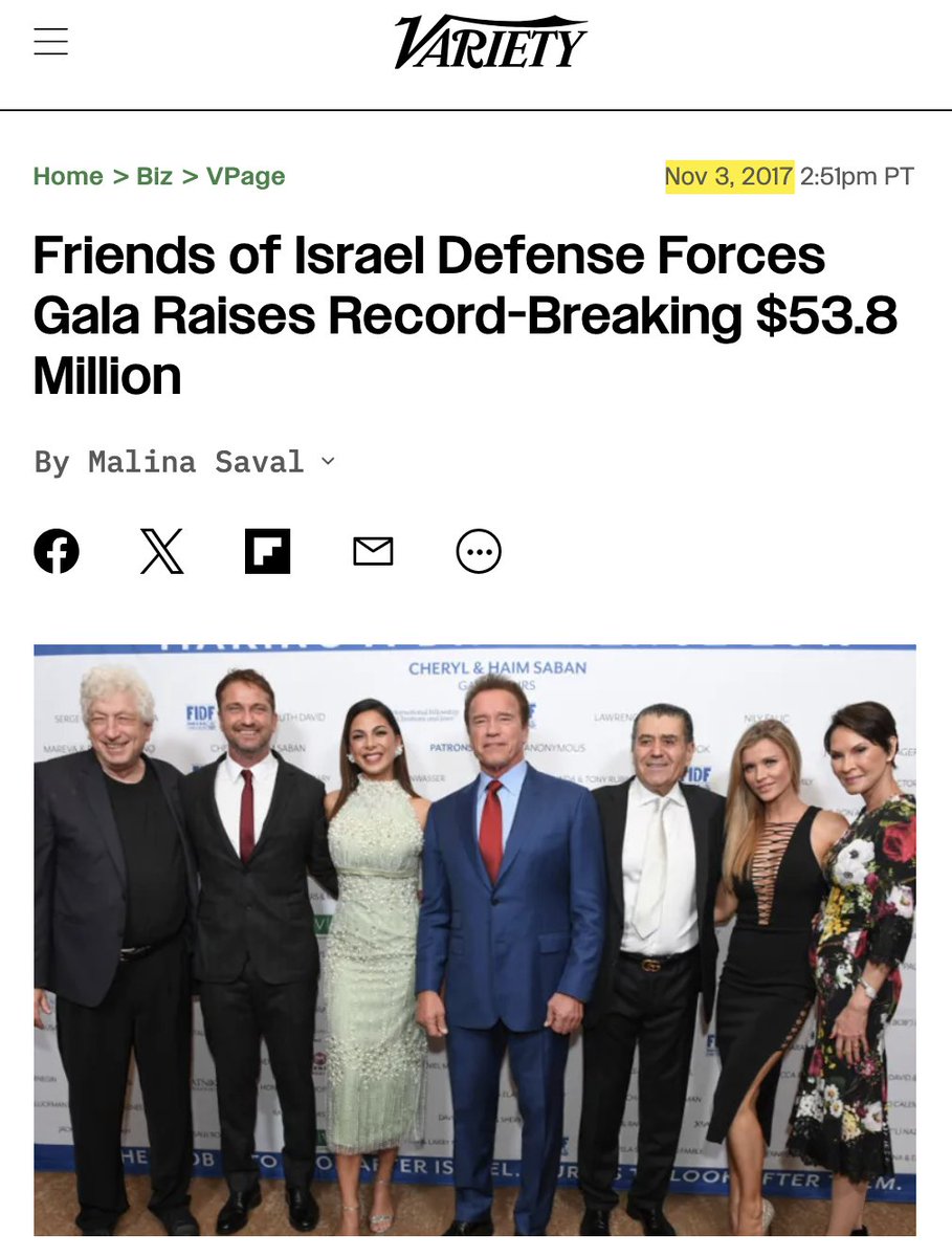 “Friends of the Israel Defense Forces (FIDF) raised a record $53.8 million... the top donation announced at the event – and the largest single gift in FIDF’s history – was $16.6 million from [Oracle's] Larry Ellison...” Nov 2017: https://variety.com/2017/biz/vpage/friends-israel-defense-forces-gala-raises-record-breaking-53-8-million-1202606799/
